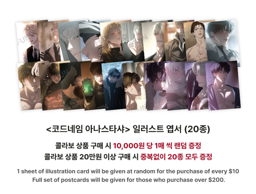 - 1 random illustration postcard given for every $10 spent on Codename: Anastasia merch (before discounts). Full set given for $200 spent on Codename: Anastasia merch.